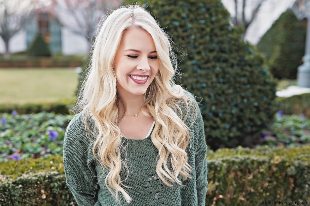 It has been a beautiful 50 degrees here this weekend and I’m getting excited to wear more dresses. I saw this outfit on a hanger at a boutique in the mall and I loved the slouchy look of it. The sleeves of the dress almost go to my elbow and there are slits on both sides. Tying a sweater gave it a little bit more shape, which I loved. Being short and wearing long, flowy pieces can be tricky, at least for me, I don’t want to look shorter than I already am. Some of my son’s 3rd grade friends are my height so I like to look taller than I am.