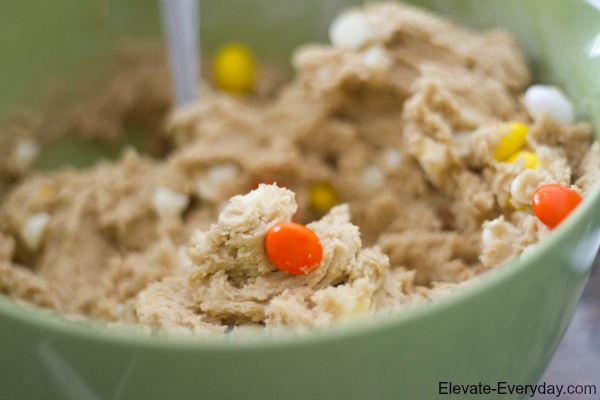- Stir in white chocolate chips, candy corn M&M’s and Hershey’s.